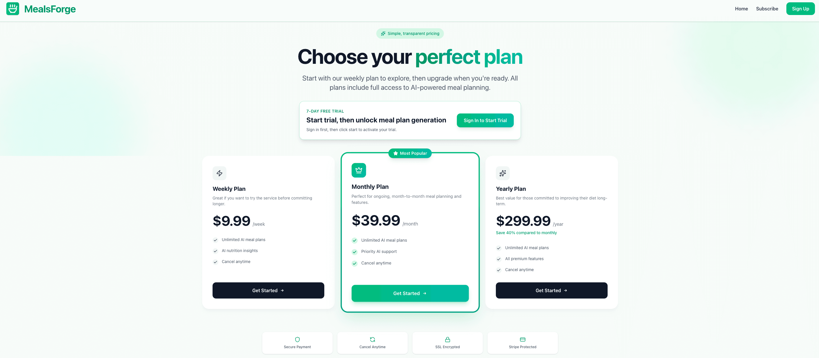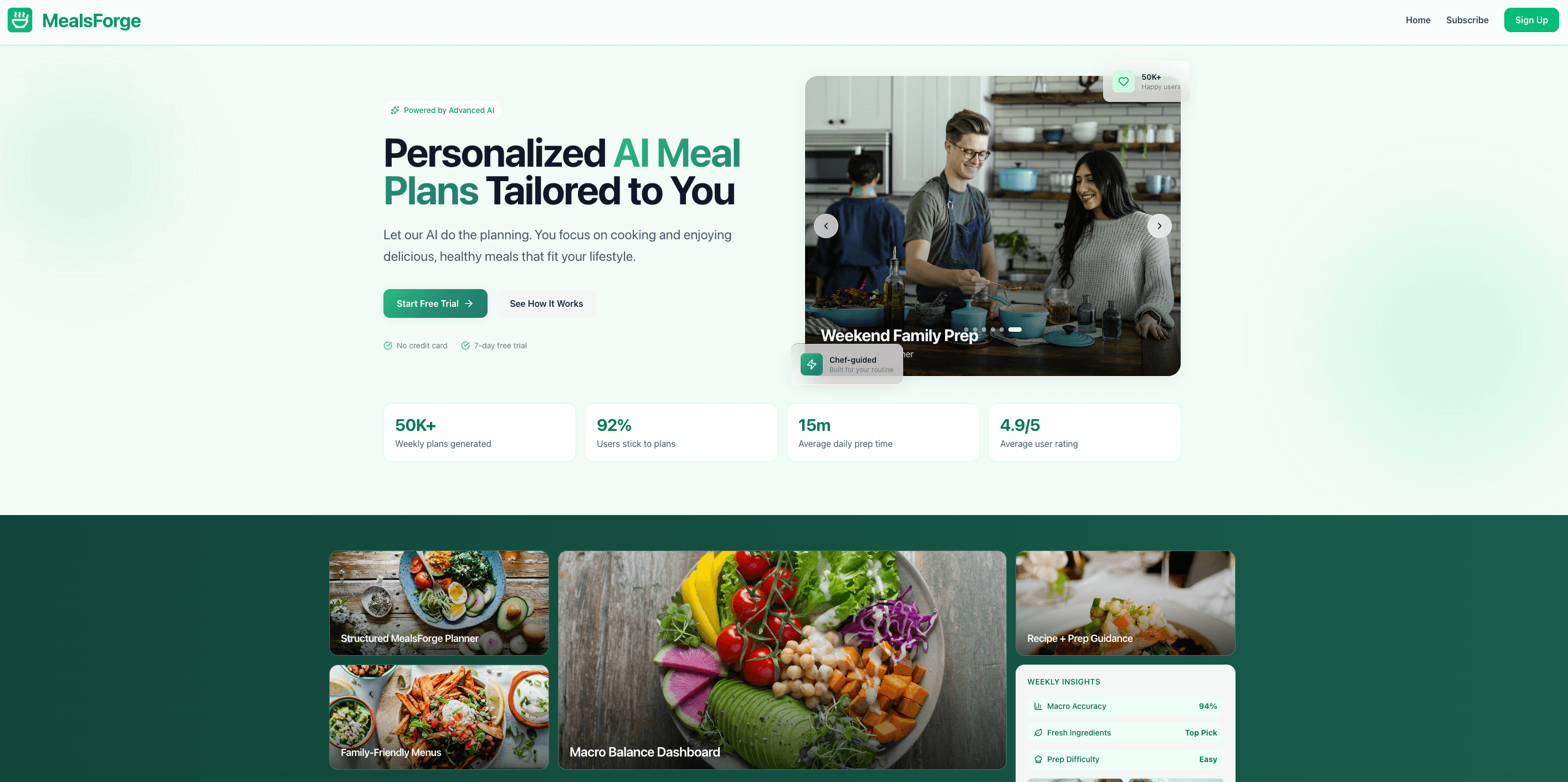 "Imagine tracking your macros manually every week, writing grocery lists by hand, and still blowing your budget by Wednesday. MealsForge eliminates that chaos — an AI that designs your personalised weekly plan, auto-builds your shopping list aisle-by-aisle, and keeps your streak alive with adherence analytics and nutritional nudges, all behind a frictionless subscription."