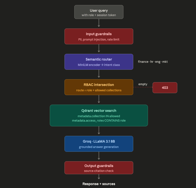 "Imagine dumping your entire company knowledge base into a chatbot, then realising any employee can now ask it to summarise the CFO's salary review or pull a confidential security audit. Role-Aware RAG Chatbot kills that risk — it semantically routes every query to the right knowledge domain (finance, HR, engineering, marketing), then hard-checks the user's role permissions before a single token is returned. Right data for the right role. A clean 403 for everyone else."