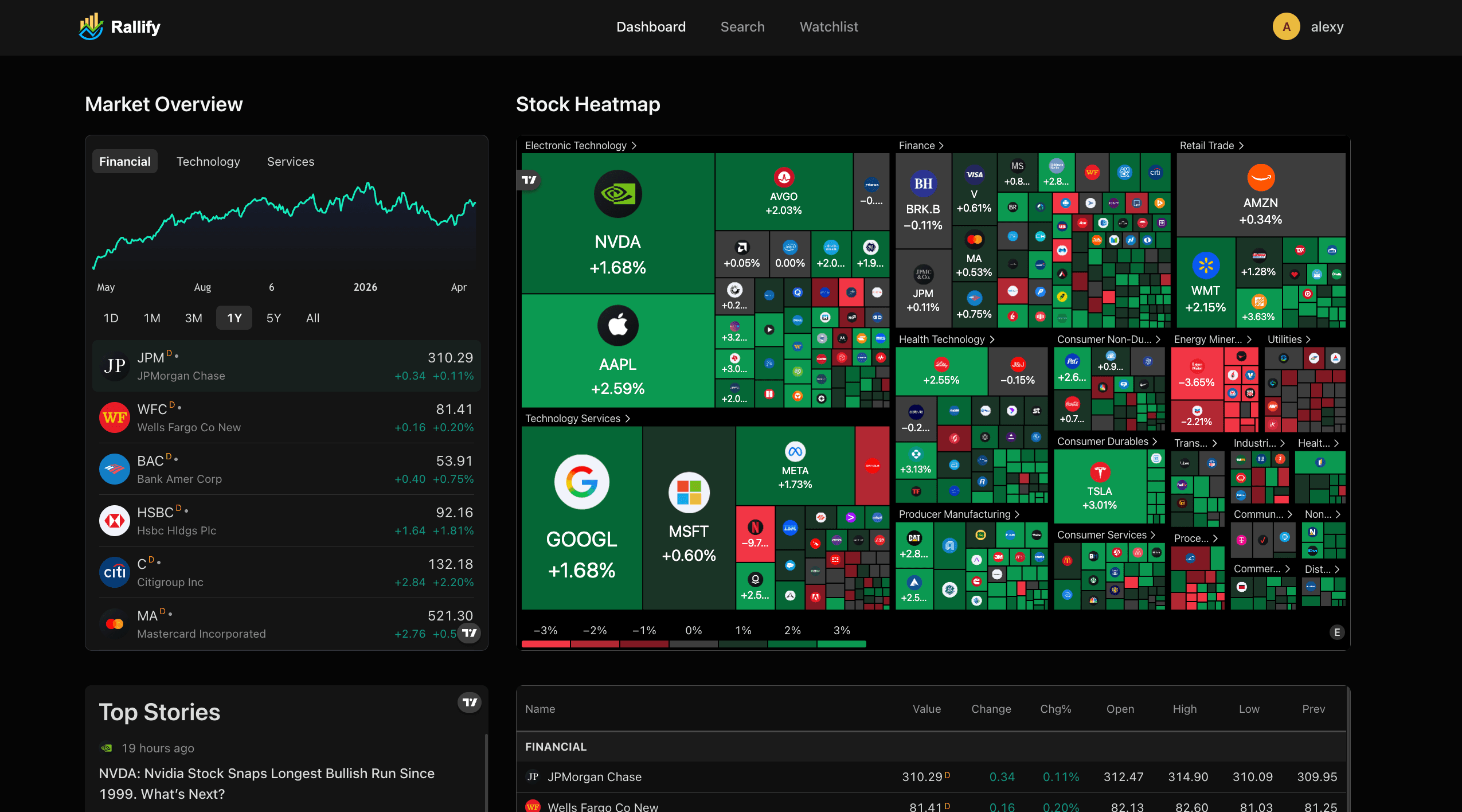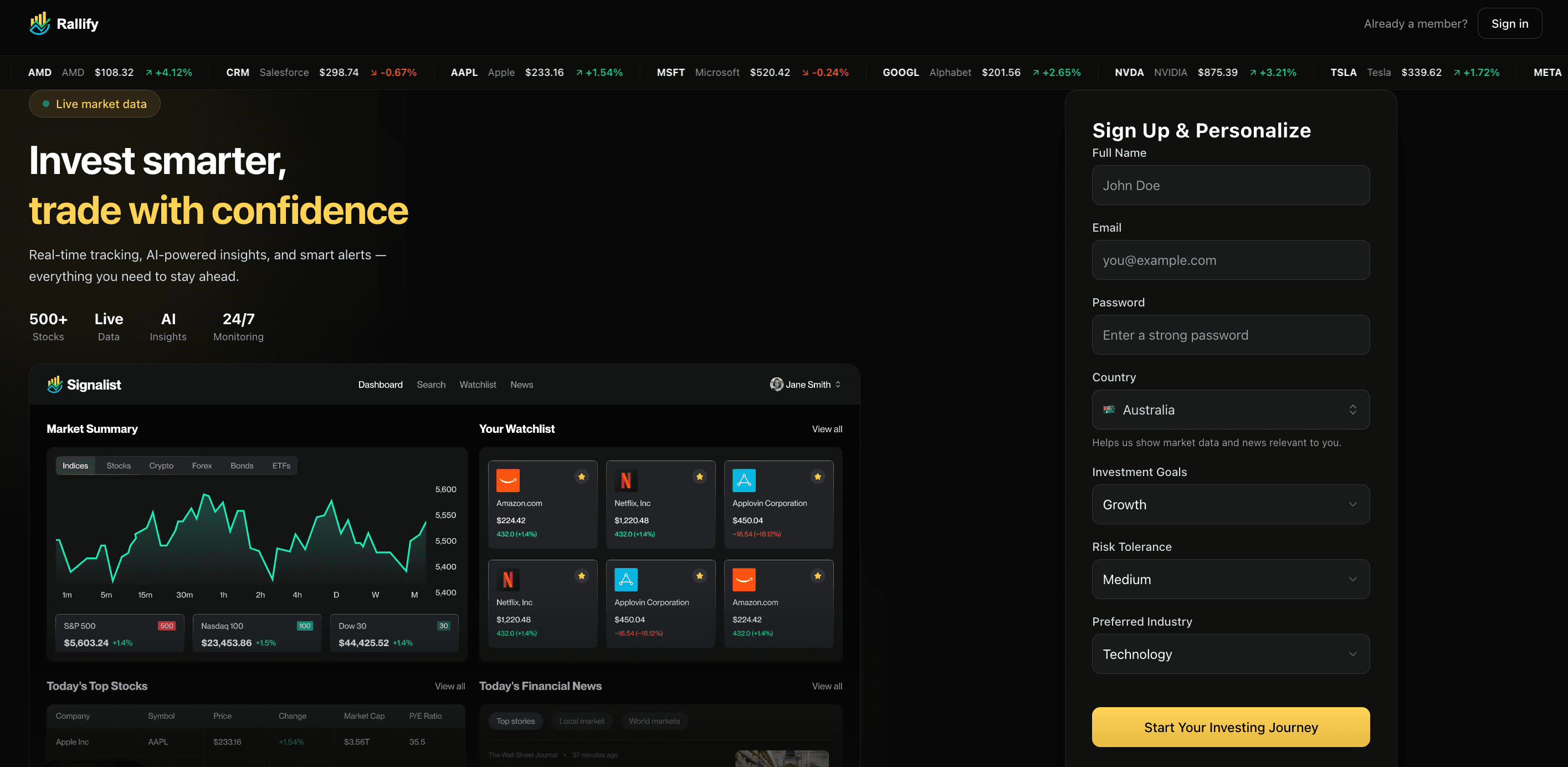 "Tracking stocks manually, missing price swings, and reading generic market news that has nothing to do with your portfolio. Rallify fixes that — a real-time stock platform with live candlestick dashboards, custom price-alert thresholds, and an AI Daily Digest that hits your inbox every morning with a personalised market summary built from your own watchlist."